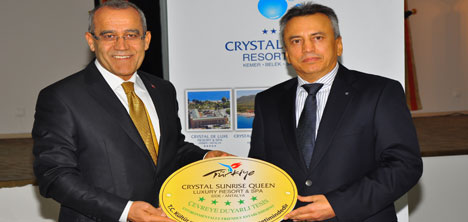 Crystal Sunrise Queen Resort&Spa Otel Side'de yapılan belge teslim törenine Kültür ve Turizm Bakan Yardımcısı Abdurrahman Arıcı, Antalya Kültür ve Turizm İl Müdürü İbrahim Acar ve Crystal Hotels yetkilileri katıldı.