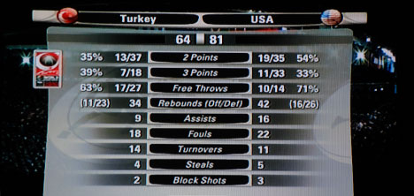 İlk yarı ABD'nin 42-32 üstünlüğü ile sona eriyor. İlk yarıda iyi savunma yapmamıza rağmen, hücumda bir türlü istediğimiz pas trafiğini sağlayamadık. Bu top kayıplarında ABDli oyuncuların agresif savunmasnın da büyük payı vardı. İkinci yarı da bu savunmayı devam ettirip, ABD'nin zayıf olduğu pota altından hücum edebilirsek şansımız olabilir. Maç henüz bitmedi.