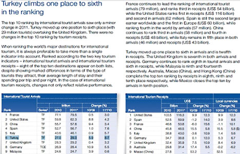 Birleşmiş Milletler Dünya Turizm Örgütü (UNWTO) tarafından yayınlanan Tourısm Highlights 2012 Edition bülteninde Türkiye İngiltere'nin önüne geçerek 6. sıraya yükseldi